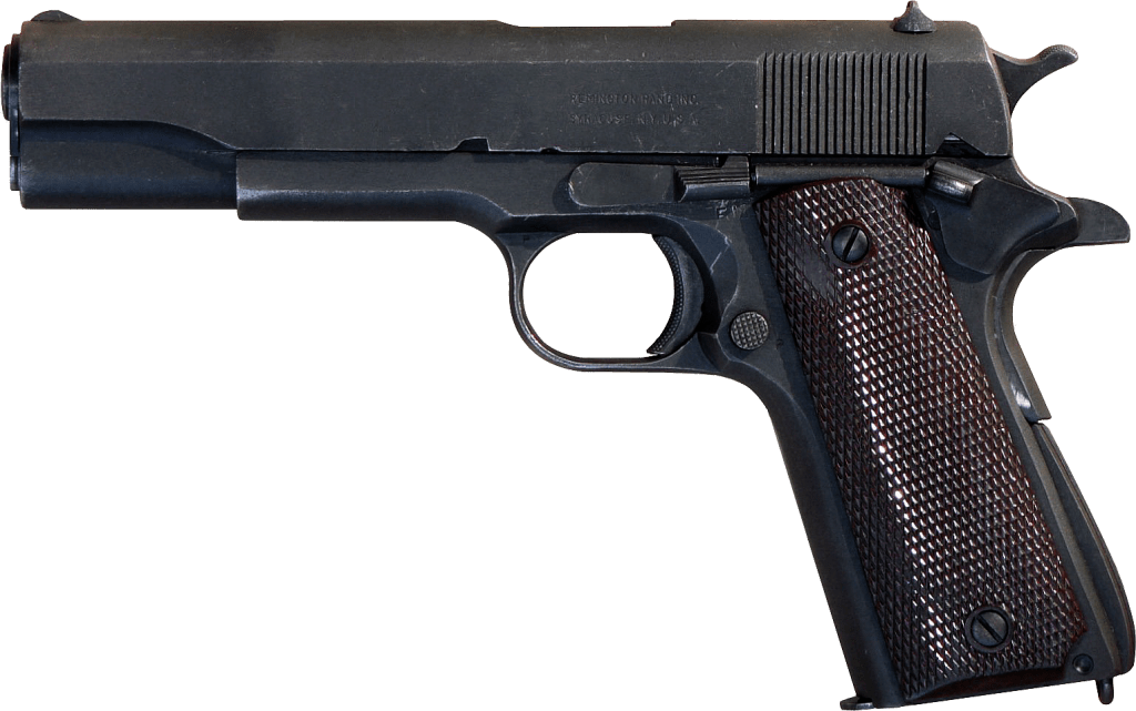 [4] A lendária pistola Colt M1911 norte-americana, em calibre 45 foi projetada por John Moses Browning e adotada como arma padrão das Forças Armadas dos Estados Unidos em 1911, permanecendo em serviço até 1985. É considerada uma arma icônica e conhecida por sua robustez e poder de parada.