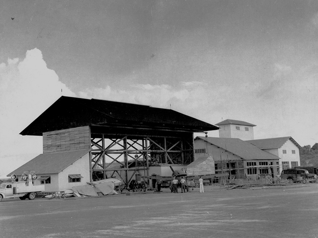 Hangar de manutenção em Recife. Salvo engano o monomotor da foto é um Grumman F6F Hellcat, caça típico dos porta-aviões americanos que patrulhavam o Atlântico Sul na caça de submarinos do eixo.