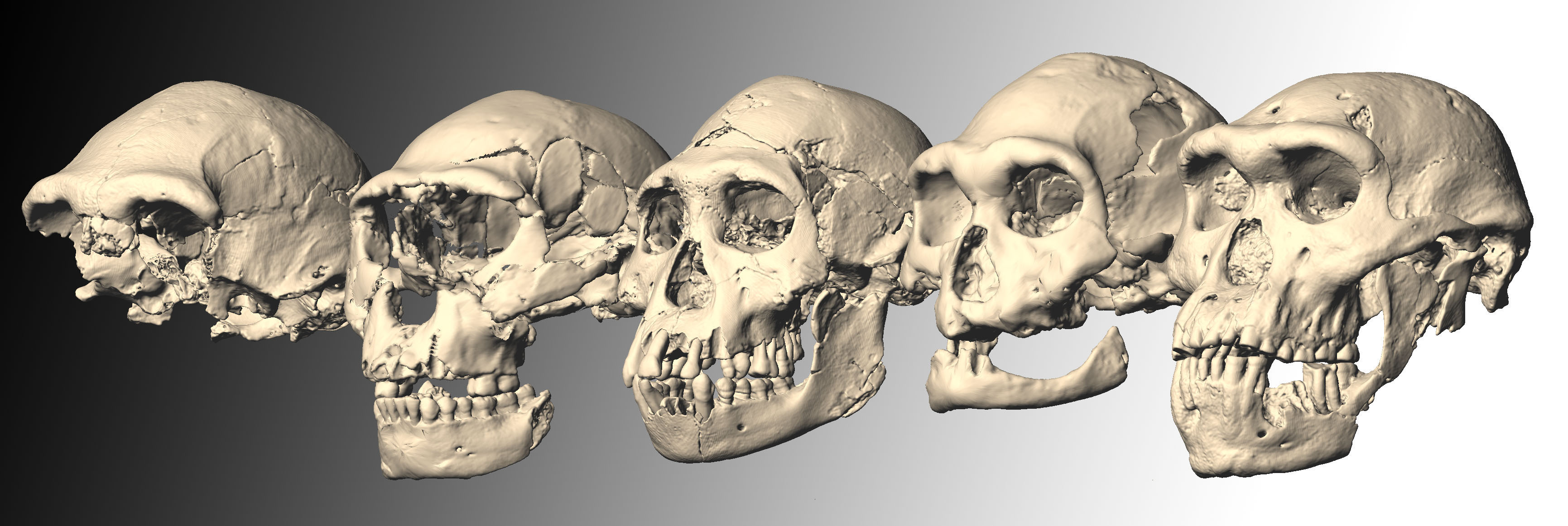 Imagem computadorizada dos cinco crânios descobertos em Dmanisi (ordenados de 1 a 5). Crédito: M. Ponce de León e Ch. Zollikofer, Universidade de Zurique