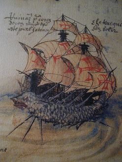 O medo dos "monstros marinhos" fazia parte das navegações do passado. Na imagem temos a nau de Rui Vaz Pereira levantada por um monstro marino, armada de 1520. Livro de Lisuarte de Abreu - Fonte - http://pt.wikipedia.org