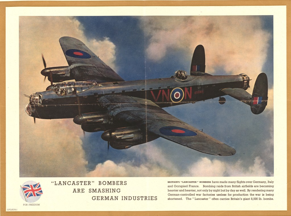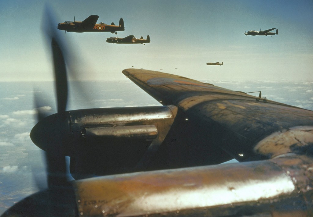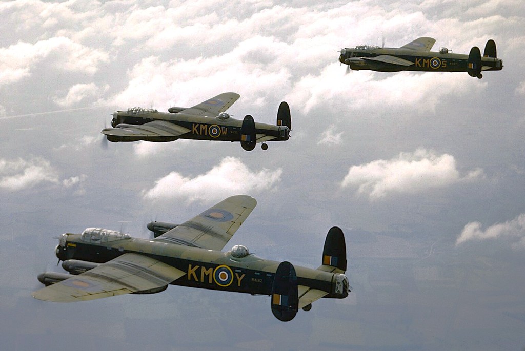 Já sobre os quadrimotores Lancaster, pode-se considerá-lo um dos maiores aviões de guerra de todos os tempos. Transportava uma carga normal de bombas de 6.300 kg e chegou a ser utilizado por 56 esquadrões do Comando de Bombardeiros da RAF. As tripulações dos Lancaster realizaram 156.000 surtidas sobre a Europa ocupada pelos nazistas e lançaram 681.645 toneladas de bombas. Com isso ajudaram a matar cerca de 600.000 pessoas, a maioria mulheres e crianças, e mais de um terço das moradias urbanas da Alemanha foram destruídas.