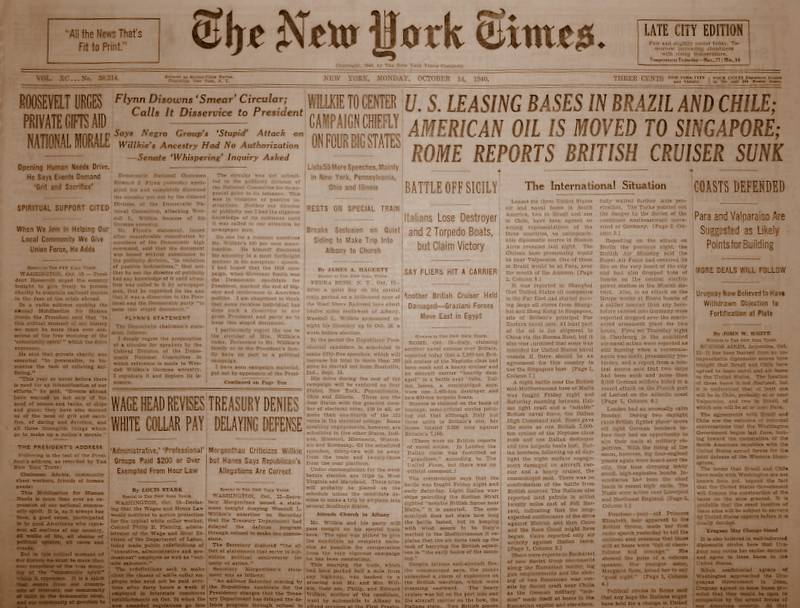 Natal no The New York Times. 14 de outubro de 1940, já falando do empréstimo das bases aéreas no Brasil.