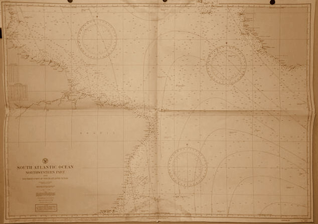 Mapa de navegação aérea da região do Atlântico Sul. esta travessia aérea, antes dos satélites e do GPS era algo que deixava os aviadores estadunidenses apreensivos
